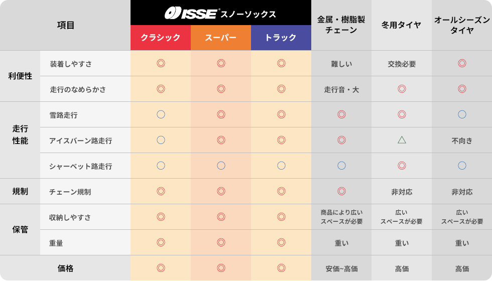 ISSEスノーソックス・チェーン・冬用タイヤ比較一覧表
