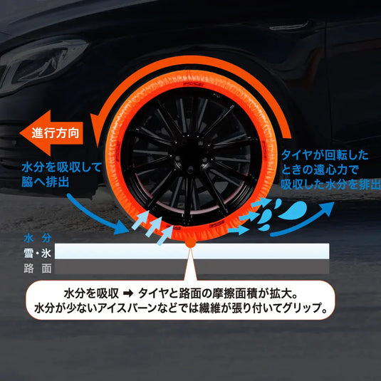 イッセの布地は、1000本以上の細かな繊維からなる糸を立体的に編み込んだ特殊な繊維構造をしています。雪道でタイヤが滑る最大の原因は、雪とタイヤの間に生じる「水の膜」です。イッセのスノーソックスは、この路面の水分を瞬時に吸水し、さらに効率よく外へ逃がす排水性を兼ね備えています。これにより、タイヤと地面が直接接地し、安定したグリップ力を発揮するのです。